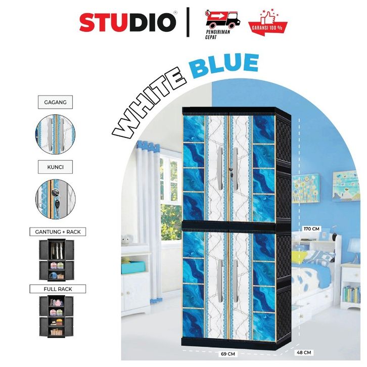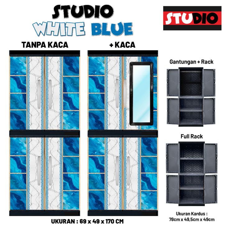 ( PRODUK BARU ) STUDIO - Lemari Pakaian Plastik Jumbo 2 Pintu Gantung + Full Rak + Kaca / Tanpa Kaca WHITE BLUE