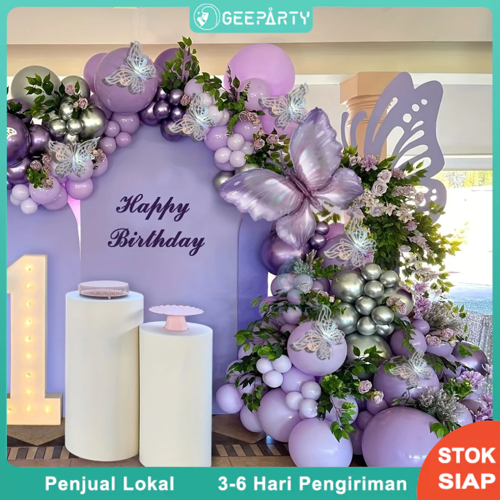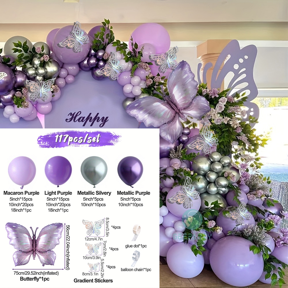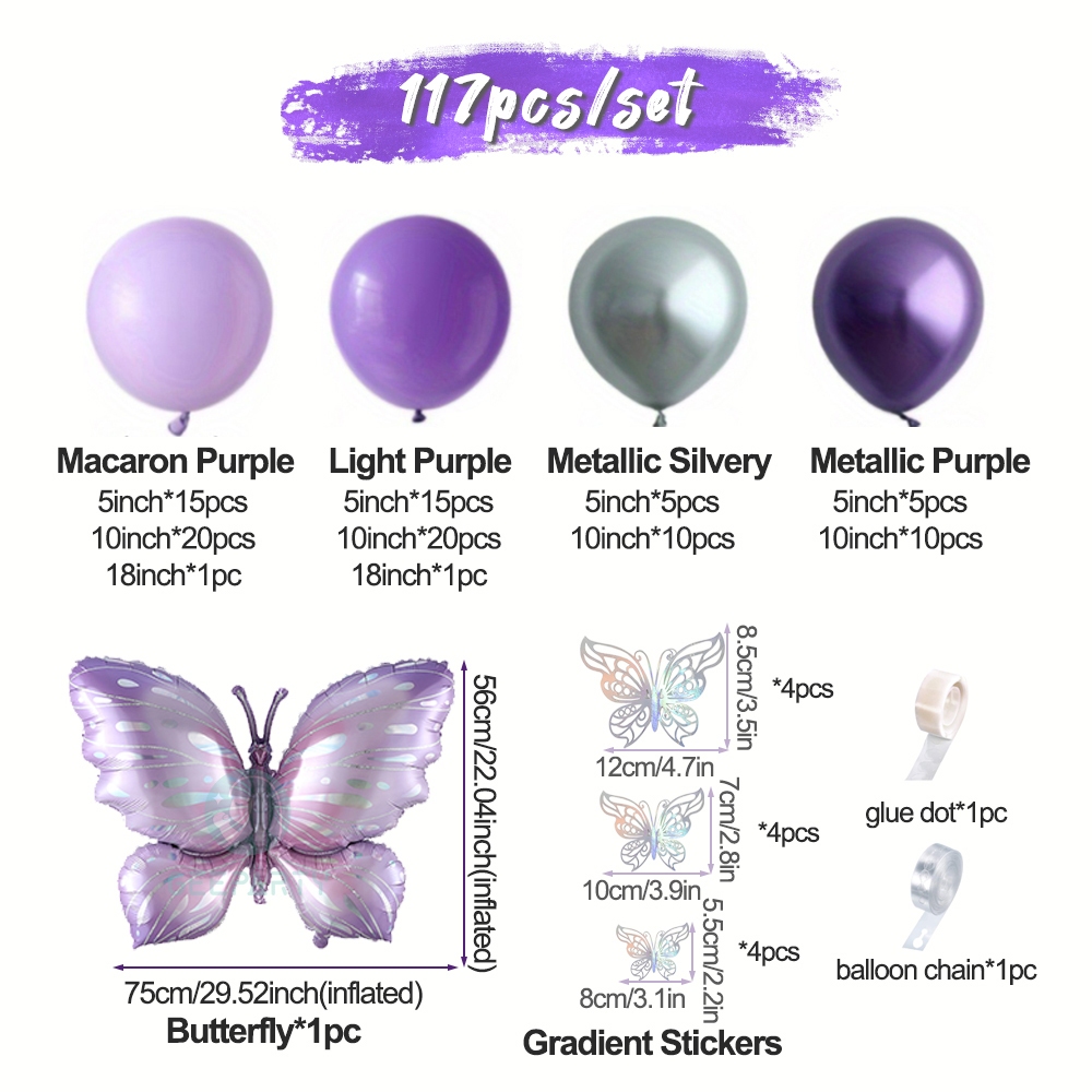 117 Pcs Macaron Ungu Set Kupu-kupu Garland Balon Metalik Foil Besar Untuk Dekorasi Pesta Ulang Tahun