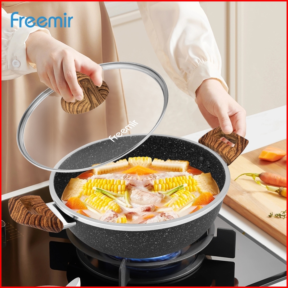 Wajan Panci 24 Cm Tinggi 10cm Penggorengan Anti Lengket Tutup Kaca Gagang Kayu Serbaguna