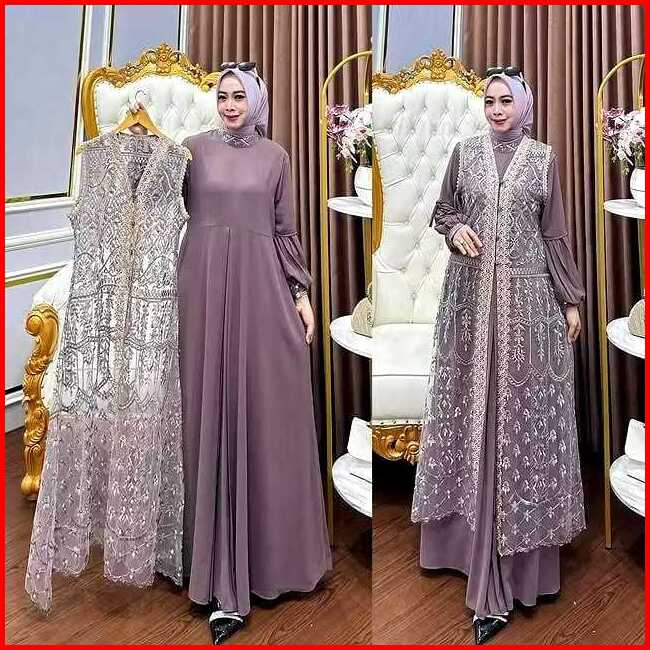 Gamis Burgundy Naura Dress Gamis Bahan Ceruty Babydoll Mix Brukat Gamis Pesta Brukat Mewah Elegant