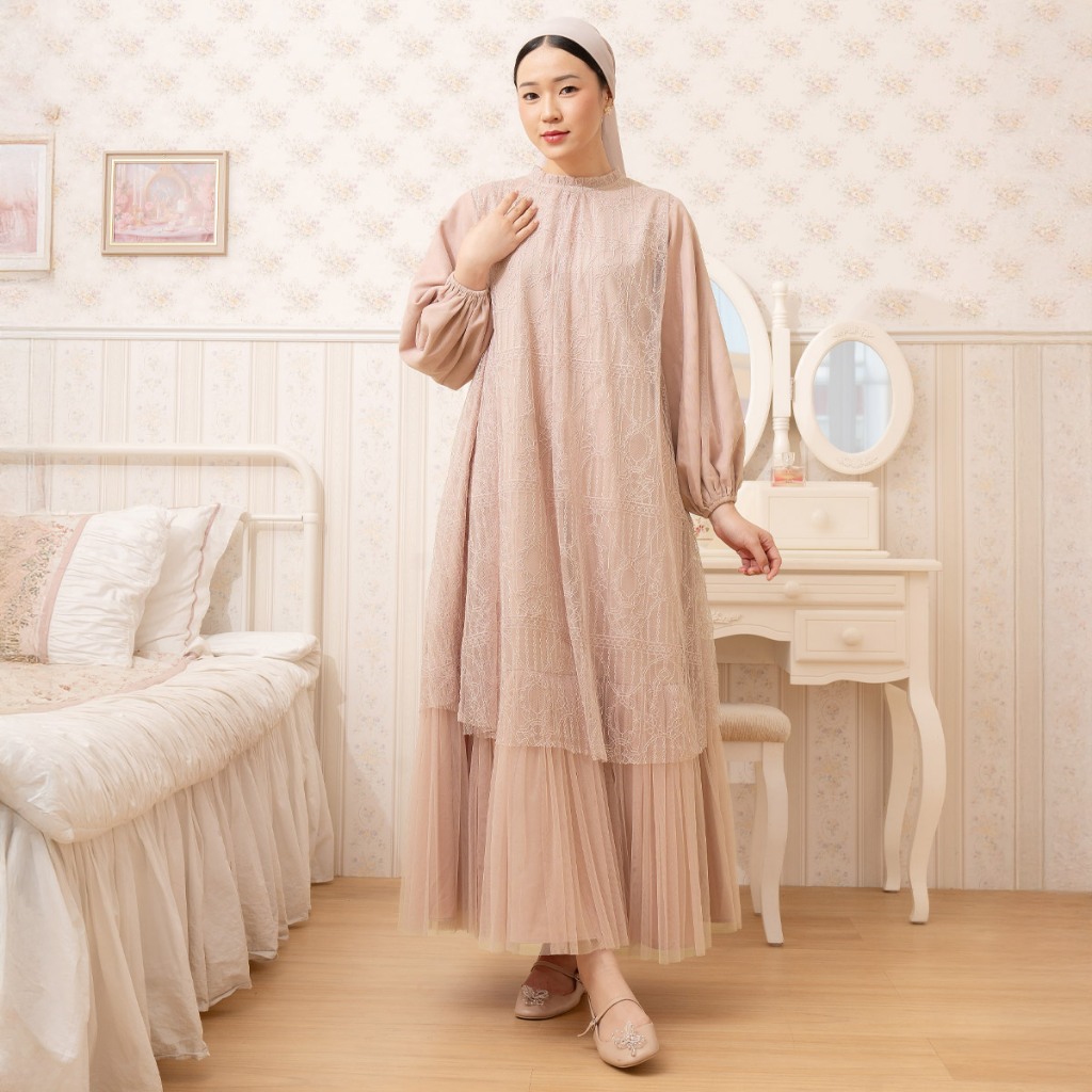 Dress Brukat Tulle Syahira Pink Nude Gaun Brukat Tulle Kondangan Elegan Best Seller