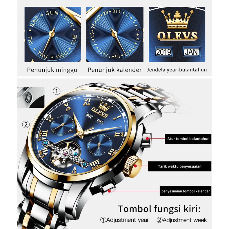 OLEVS Jam Tangan Automatic Pria Anti Air Original Tahan Keren Led Terbaru 2024 Luxury Stainless Watch Men Hitam Biru Hij