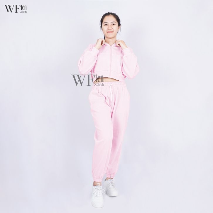 One Set Hoodie Zipper Crop + Celana Jogger Panjang Sweatpants One Set Korea