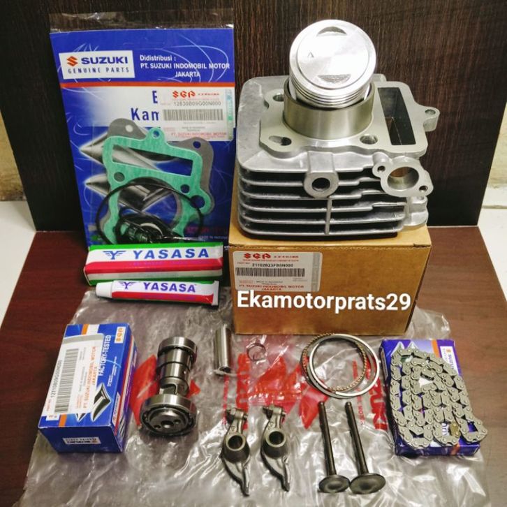 Paket Blok Seher isi komplit + Noken as + Platuk klep + klep set + Rantai + Topset + Lem Suzuki Smash 110 lama/Old