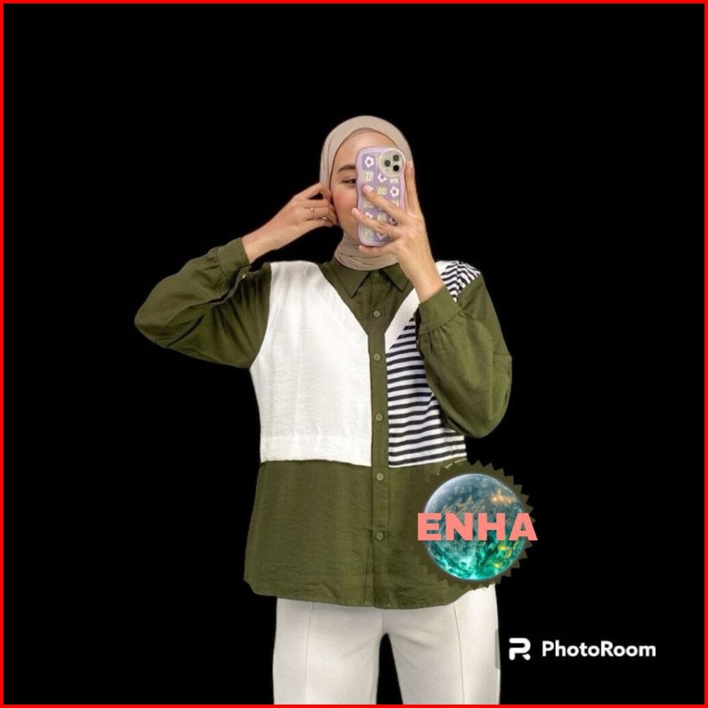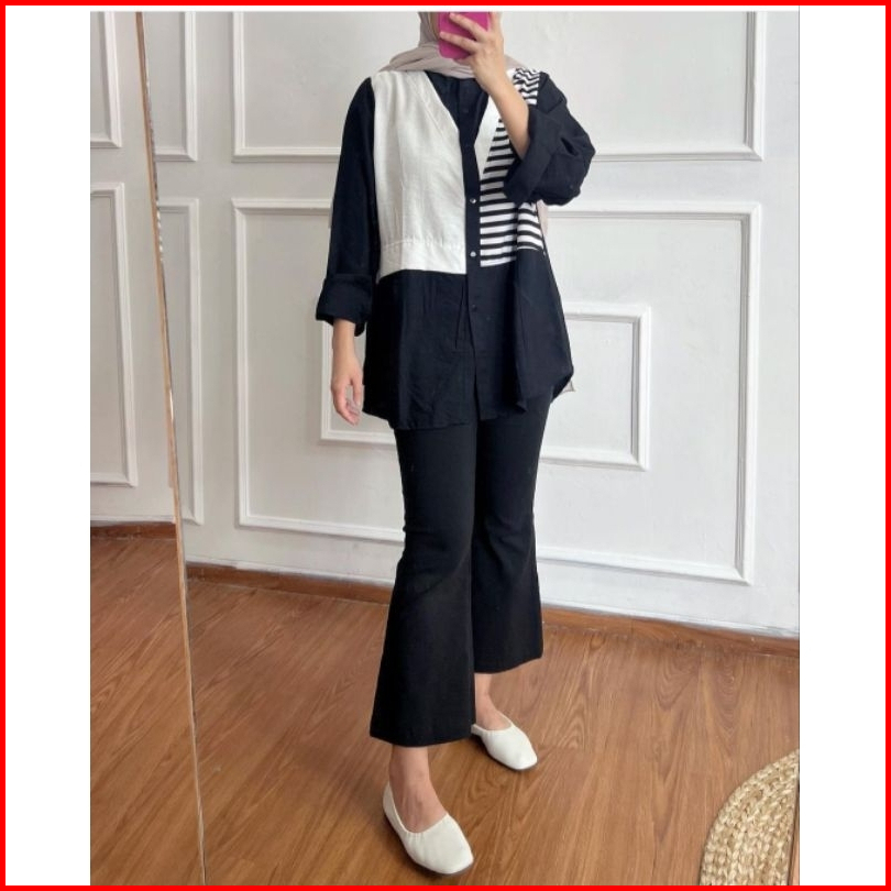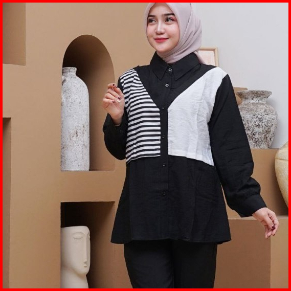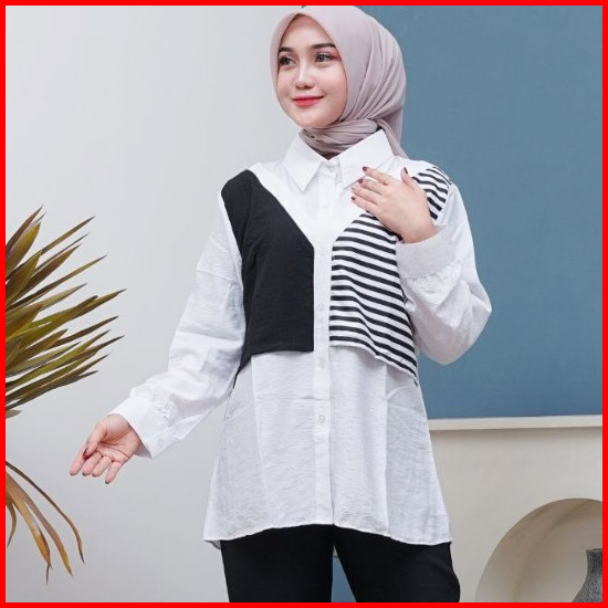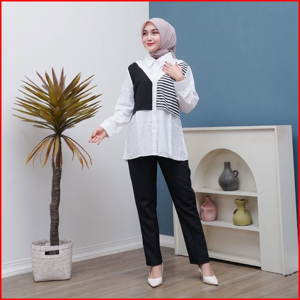 Silvi Kemeja Pollo Linen Kombinasi Rompi Salur Atasan Formal Casual Wanita