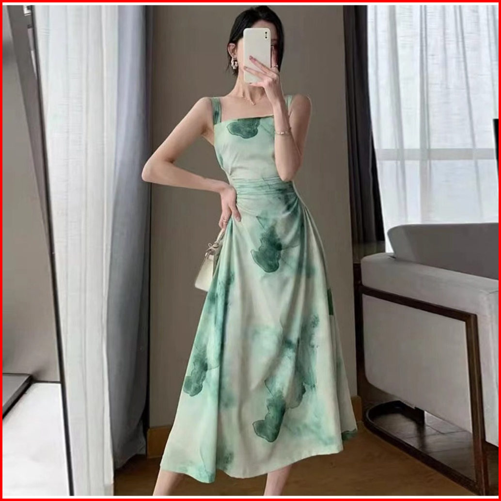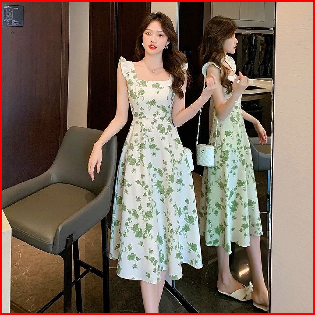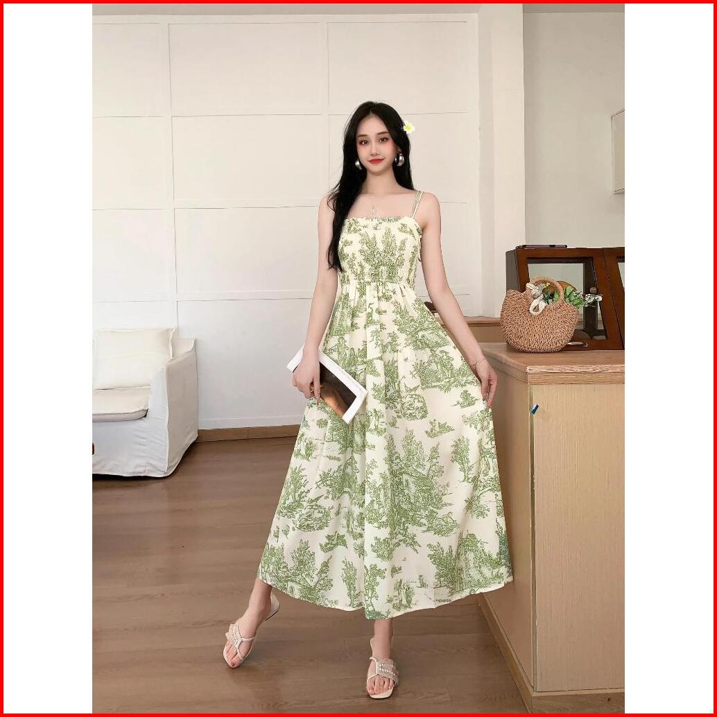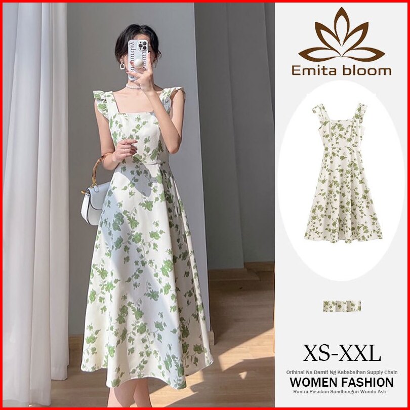 Emita Bloom Flowy Long Dress Motif Bunga Pantai Korean Style Dress Wanita Kekinian Hijau Sage Dress Press Body Terbaru 2