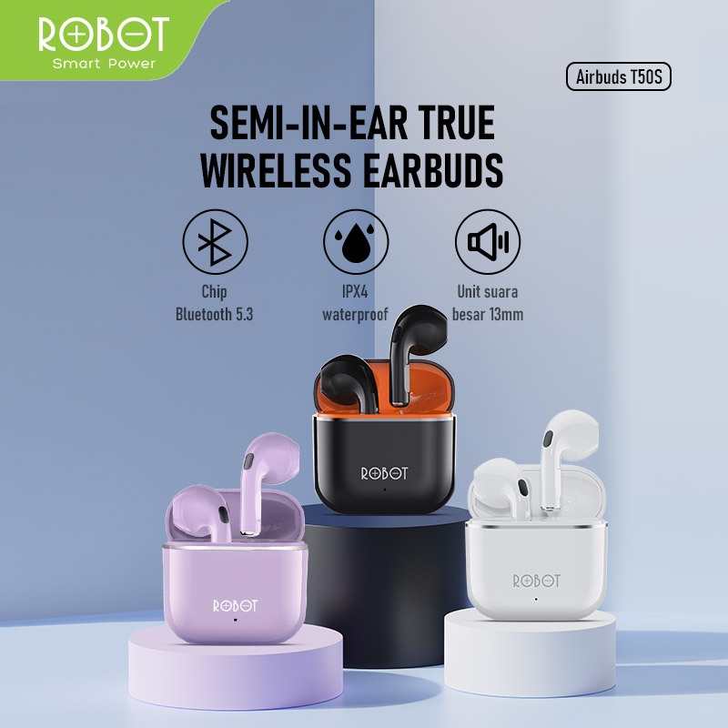 Headset Bluetooth FREE CASING ROBOT TWS Wireless Earphone Airbuds T50S Original BT 5.3 True Wireless Earbuds IPX4