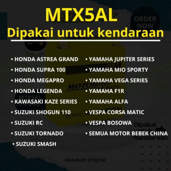 AKI MOTOR MOTOBATT MTX5AL ORIGINAL / GM5Z-3B / HONDA ASTREA9rAND / SUPRA / SHOGUN / YAMAHA JUPITER SERIES Garansi 2 B