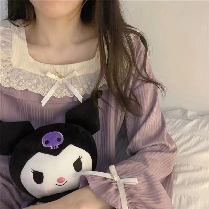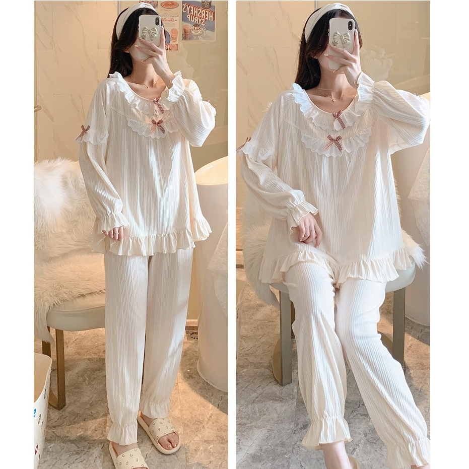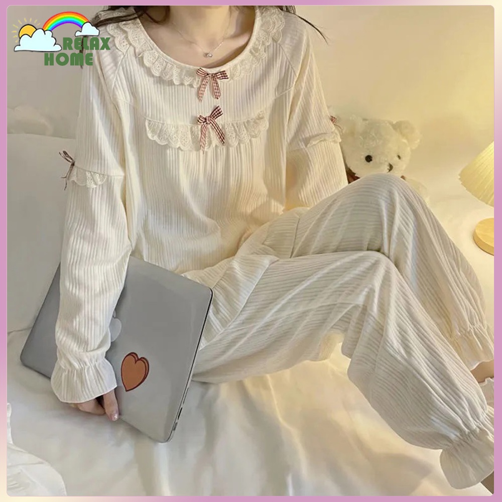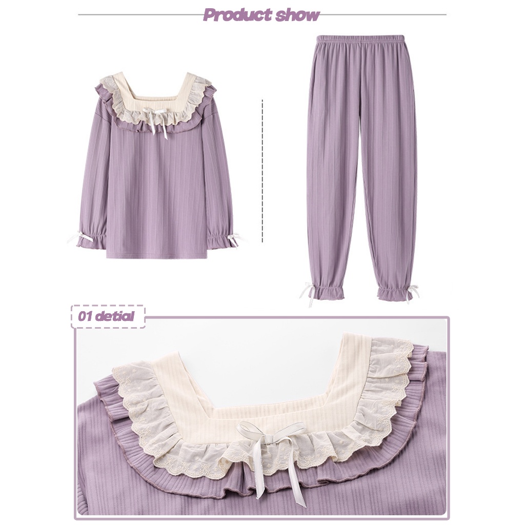 Wanita Lengan Panjang Celana Renda Piyama Set Longgar Homewear