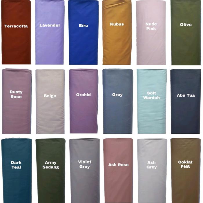 Abu Muda, Abu Tua, Army, Ash Rose, Baby Blue, Biru, Biru Denim, Broken White, Burgundy, Coklat PNS, Dark Mocca, Dark Teal, Dove, Dusty Rose, Frappuccino, Grape, Green Tea, Grey, Hijau Botol, Hijau Tosca, Hijau Wardah, Hitam, Khaki, Kubus, Lilac, Lime, Maroon, Maroon Tua, Matcha, Merah, Milo, Navy, Nude Pink, Olive, Pemda, Putih, Red Wood, Sage Green, Sand, Soft Lilac, Soft Wardah, Steel Blue, Taro, Terracotta, Ungu Magenta, Violet Grey