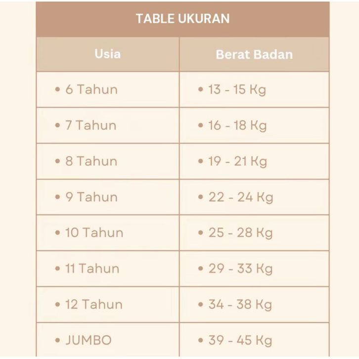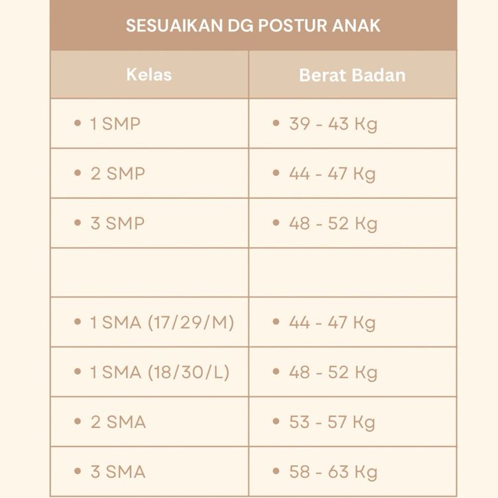 1 SMA 17/29, 1 SMA 18/30, 1 SMP 15/27, 1 SMP 16/28, 10 tahun, 11 tahun, 12 tahun, 2 SMA 19/31, 2 SMP 17/29, 3 SMA 20/32, 3 SMP 18/30, 6 tahun, 7 tahun, 8 tahun, 9 tahun, SD JUMBO (39-45 Kg)