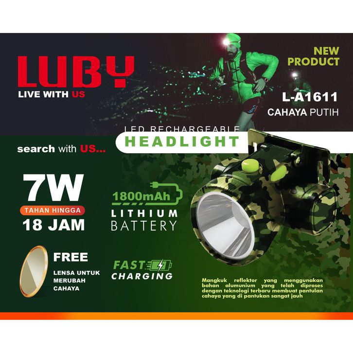Senter Kepala Luby 7 Watt Baterai Cas Ulang L2871 & LA1611 Headlamp Head lamp