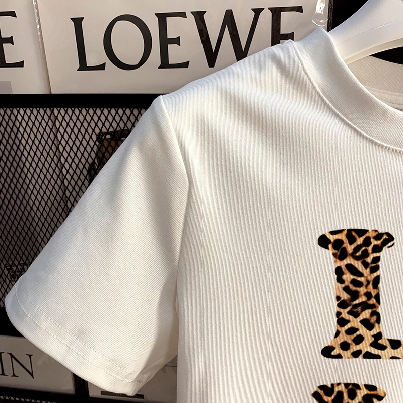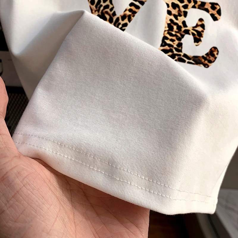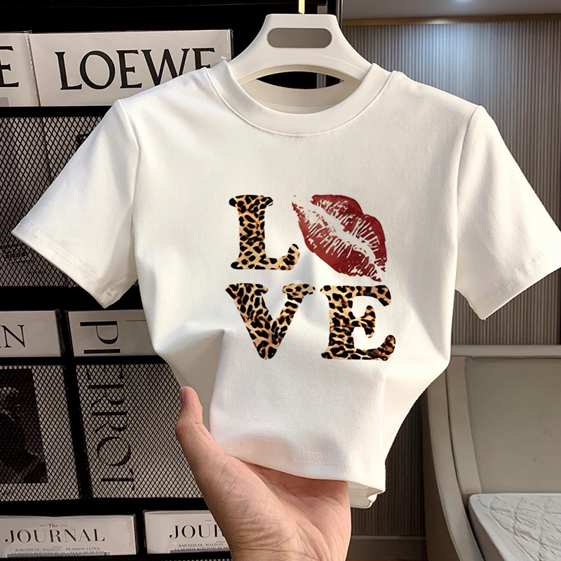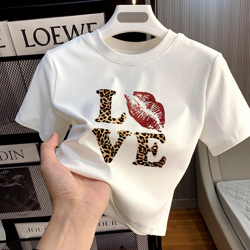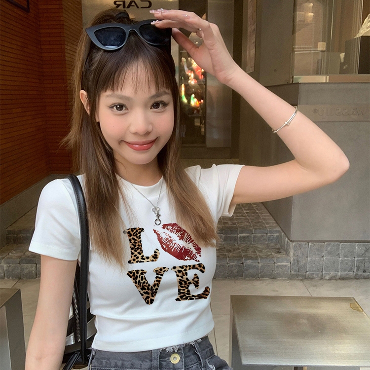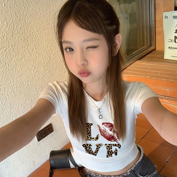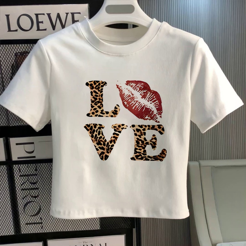 DSSTORY T-shirt Crop Top y2k Lengan Pendek Baju Kaos Crop Wanita | Macan Tutul LOVE | Baju Atasan Wanita Terbaru Croptee Putih Korea 5.24