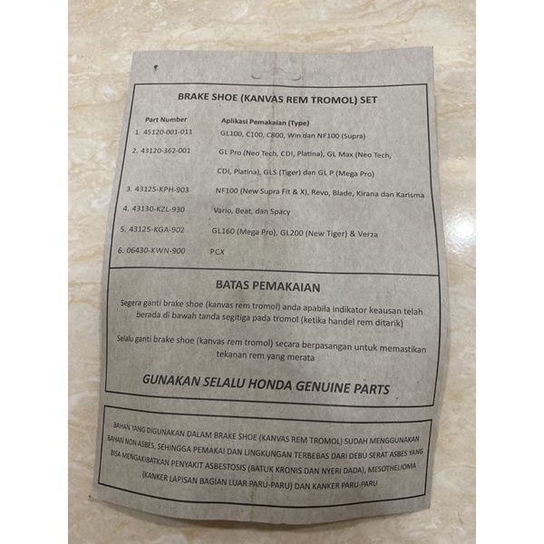 KAMPAS REM TROMOL BELAKANG GRAND ASTREA LEGENDA PRIMA WIN IMPRESSA SUPRA X FIT LAMA ORIGINAL ORI ASLI HONDA AHM
