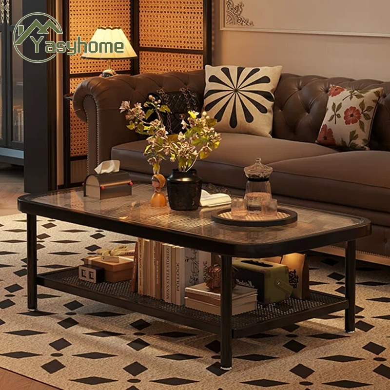⭐Kaca Yang Diperkuat& Baja karbon⭐Meja Kaca Tempered Meja Tamu 90*50*40 cm/Desain rotan kerawang berlapis ganda& Meja