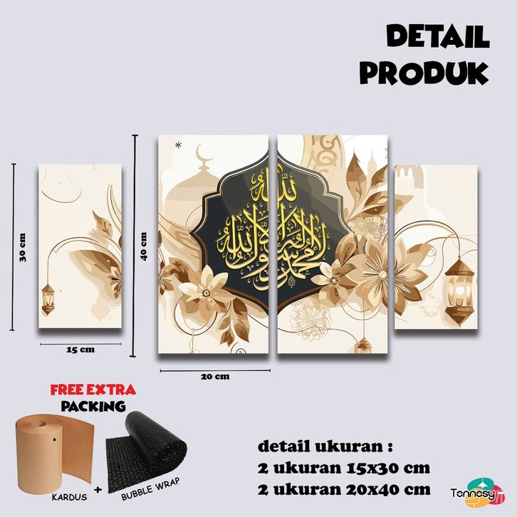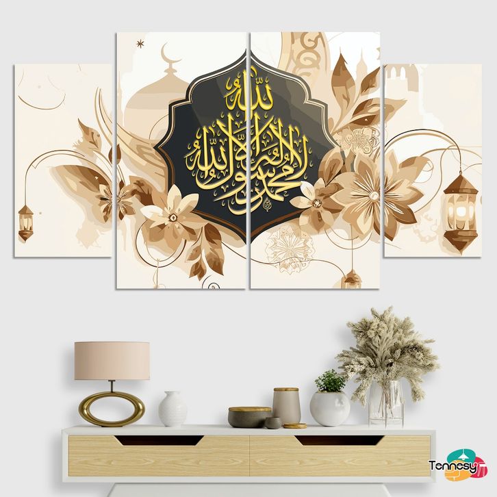 TENNESY Hiasan Dinding Aesthetic 1 Set Islamic Flowers With Gold Kaligrafi 4 Panel Wall Decor