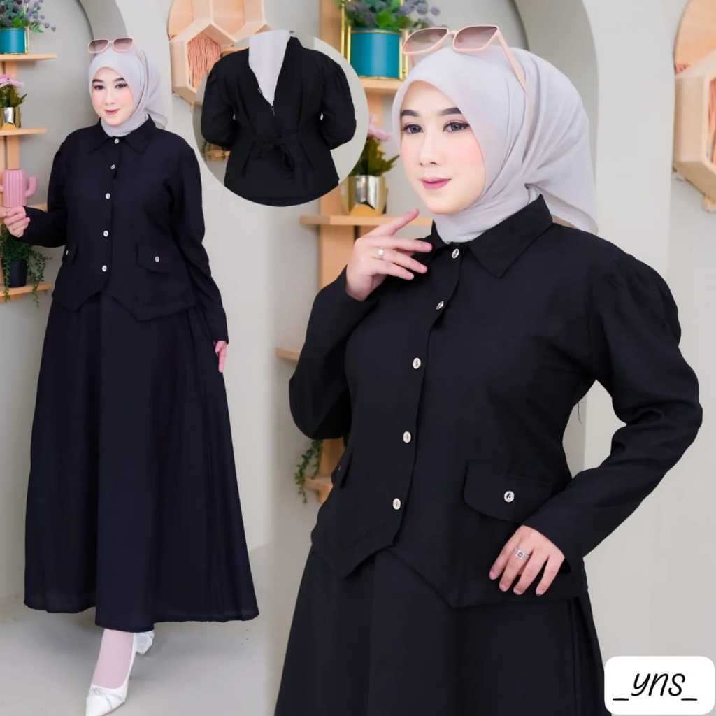 SET LULA MUSLIM POLO LINEN KANCING AKTIP TALI BELAKANG ROK DENGAN SAKU