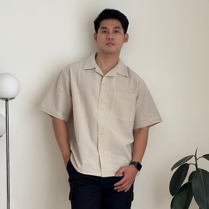 COZYCLUB CUBAN BOWLING Shirt Linen Premium | Kemeja Bowling Kerah Terbuka Lengan Pendek Baju Dark Grey Panjang