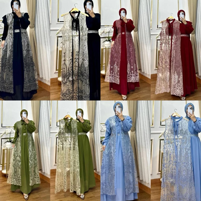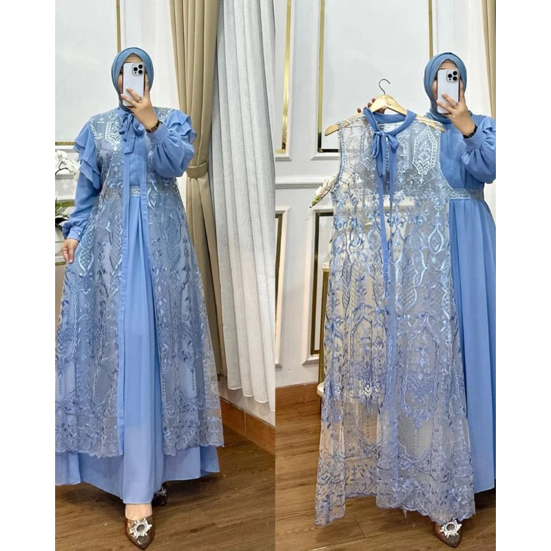 DRESS BRUKAT 2IN1 ELEGAN TERMURAH GAMIS KONDANGAN WANITA BAHAN CERUTYBABYDOLL MIX BRUKAT MEWAH