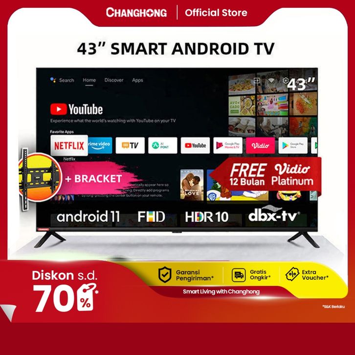 Changhong Smart TV Digital 43 Inch Android 11 Frameless TV-L43G7N Garansi Resmi 3 Thn Original Official Store