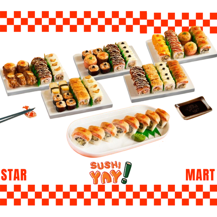 Sushi Tsubasa Platter, Sushi Murashi Platter, Sushi Salmon Platter, Sushi Okemura Platter, Sushi Hemato Platter, B1G1 Salmon Mentai, B1G1 Beef Monsta, Beef Monsta, Chicken Fiesta, Hot & Spicy Chicken, Salmon Mentai, Salmon Trio Platter, Sushi Konoha Platter, Sushi Ultimate Platter, Sushi Beef Platter, Ultimate Salmon Mentai Roll, Spicy Salmon Ikura Roll, Truffle Beef Roll, Teriyaki Dragon Roll, Chicken Miso Garlic Roll, Yay! Canape, Spicy Karaage Roll, Gyuniku Roll, Bulgogi Beef Roll, Tuna Salad Crunchy Roll, Salmon Dynamite Roll, Salmon Mentai Roll, Chicken Teriyaki Don, Katsu Don, Katsu Curry Don, Beef Teriyaki Don, Katsu Mentai Rice, Salmon Skin, Chicken Karage, Chicken Karaage Mentai, Nori Tempura, Takoyaki, Aqua 330ML, Coca Cola Slim 250ML, Sprite Slim 250ML, Teh Pucuk Harum 350ML, Ocha