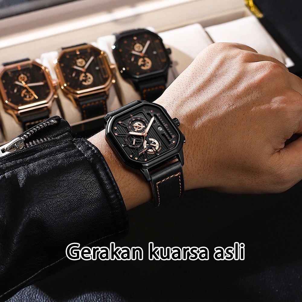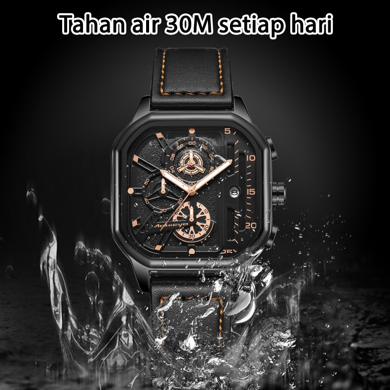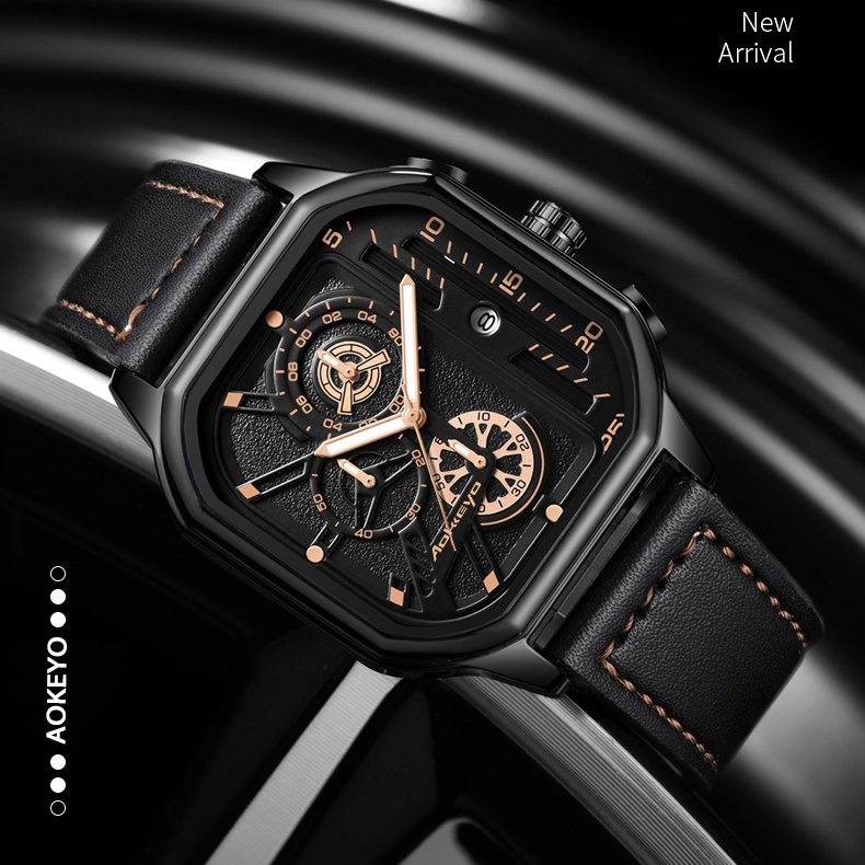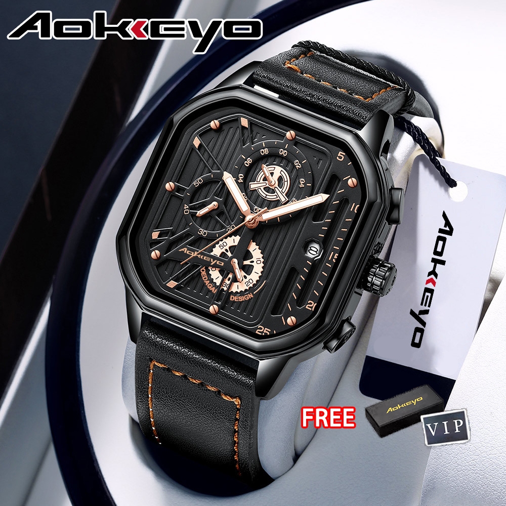 AOKEYO S045 Jam Tangan Pria Kuarsa Olahraga Kasual Tali Kulit Pria Jam Tangan Cowok(Free BOX + Kartu Garansi)