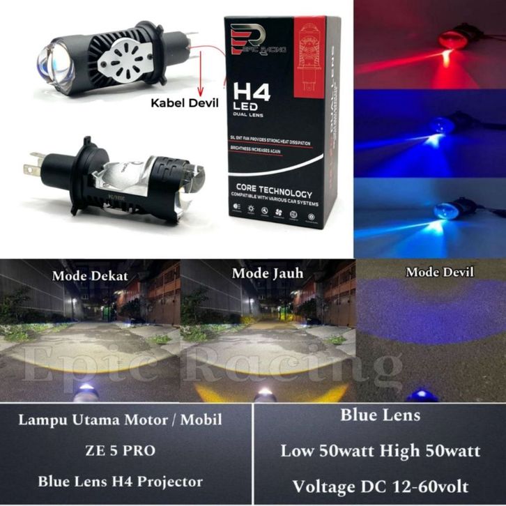 Lampu Utama ZE 5 PRO Blue Lens H4 Projector Dengan Devil Eye Plus Kipas Pendingin Full Aluminium Waterproof