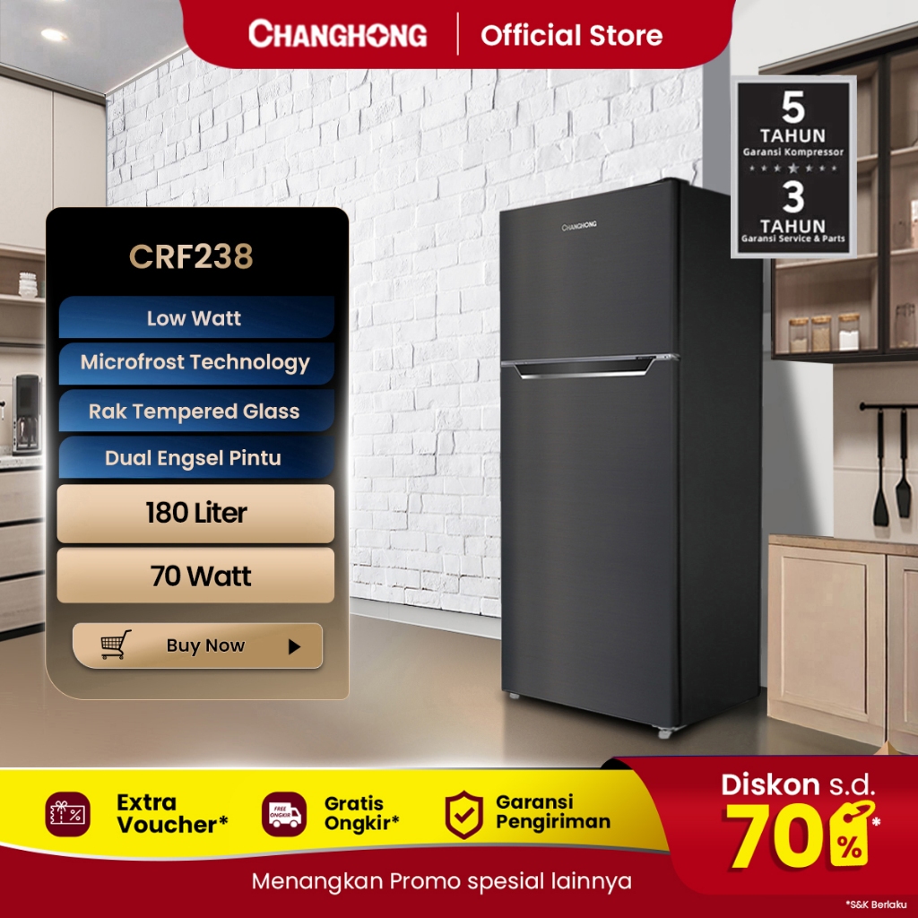 KULKAS 2 PINTU CHANGHONG REFRIGERATOR LEMARI ES KAPASITAS 180 LITER CRF238 BLACK SEMI AUTO NO FROST KAPASITAS BESAR