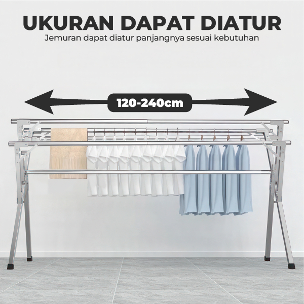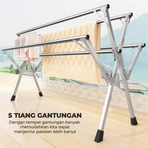 Jemuran Baju Lipat 5 Tiang Jemuran Pakaian Anti Karat Kuat Jemuran Baju Portable Tanpa Instalasi