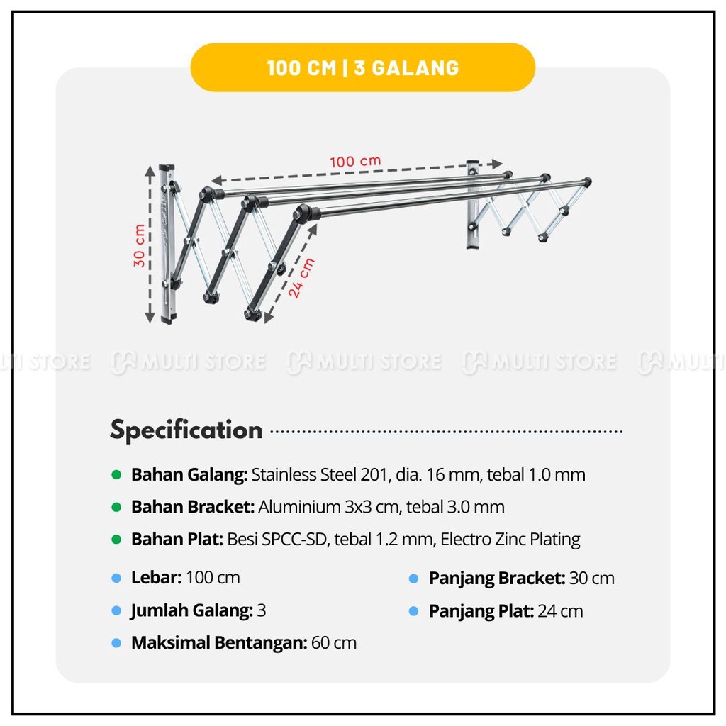 PLBOK Jemuran Baju Dinding Lipat Stainless 100 CM 3 Galang Kuat Murah Anti Karat PELBOK