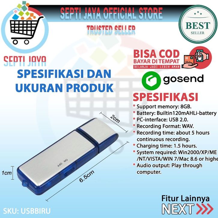 VOICE RECORDER MEMORI 8 GB SPY USB FLASH DRIVE B-irU BLUE RESOLUSI TINGGI FREE 8GB FLASHDRIVE ORI