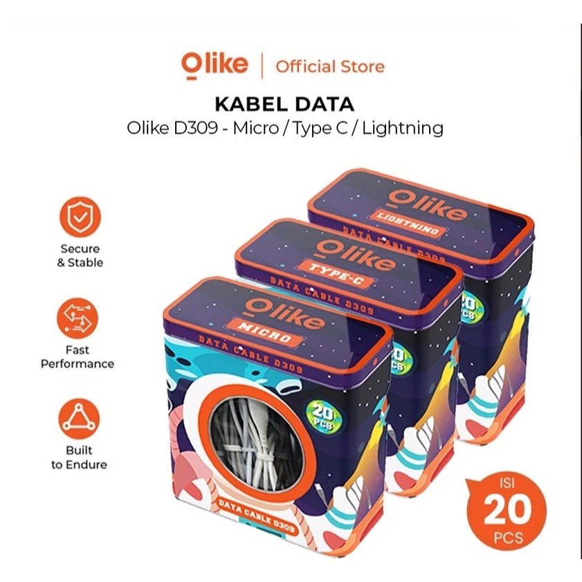 KABEL DATA OLIKE D309 MICRO/TYPE-C/LIGHTNING 1 KALENG ISI 20 PCS 1M DATA CABLE FAST CHARGING READY GARANSI RESMI 20 PCS