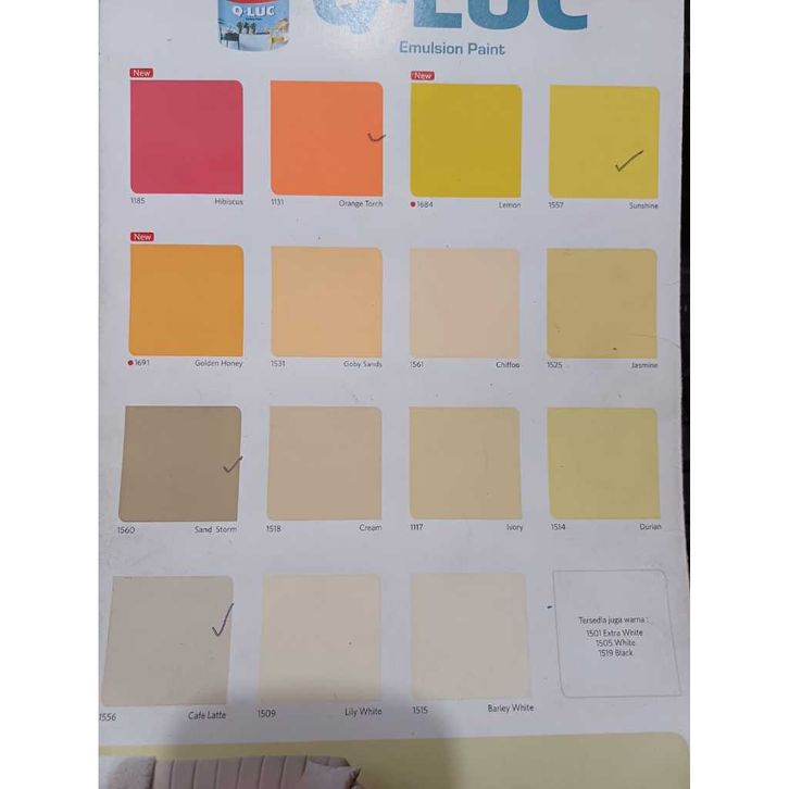 ATLANTIC - 1541, ATLANTIC-1541, ATLANTIC1541, BARLEY WHITE - 1515, BARLEYWHITE-1515, BLACK - 1519, BLACK-1519, BLUE BEAUTY - 1526, BLUE BEAUTY-1526, BLUE WHITE - 1503, BLUE WHITE-1503, BRIGHT GREEN - 1657, BRIGHT GREEN-1657, CAFE LATTE - 1556, CAFE LATTE-1556, CANDY PINK - 1562, CANDY PINK-1562, CHIFFON - 1561, CHIFFON-1561, CLEAR SKY - 1690, CLEAR SKY-1690, COPPER GREY - 1549, COPPER GREY-1549, CREAM - 1518, CREAM-1518, DURIAN - 1514, DURIAN-1514, EXTRA WHITE 1501, EXTRA WHITE-1501, GOBY SANDS - 1531, GOBY SANDS-1531, GOLDEN HONEY - 1691, GOLDEN HONEY-1691, GRAYCLOTH - 1550, GRAYCLOTH-1550, GREEN FREEWAY - 1540, GREEN FREEWAY-1540, HAPPY FUSCHIA - 1554, HAPPY FUSCHIA-1554, HIBISCUS - 1185, HIBISCUS-1185, HIJAU TELOR - 1154, HIJAU TELOR-1154, IVORY - 1117, IVORY-1117, JASMINE - 1525, JASMINE-1525, LAKESTONE - 1539, LAKESTONE-1539, LAVENDER PRINT 1553, LAVENDER PRINT-1553, LEMON - 1684, LEMON-1684, LILY WHITE - 1509, LILY WHITE-1509, LIME GREEN - 1546, LIME GREEN-1546, MARINA - 1534, MARINA -1534, MOON GLOW - 1671, MOON GLOW-1671, ORANG TORCH-1131, ORANGE TORCH - 1131, ORANGE TORCH-1131, PEACE BLUE - 1555, PEACE BLUE-1555, PINK POSY - 1552, PINK POSY-1552, REAL MORADO - 1688, REAL MORADO-1688, SAND STORM - 1560, SAND STORM-1560, SKY BLUE - 1533, SKY BLUE-1533, SPRING VIGOR - 1681D, SPRING VIGOR 1681D, STONE GREY - 1548, STONE GREY-1548, SUNSHINE - 1557, SUNSHINE-1557, SWIMMING BLUE - 1547, SWIMMING BLUE-1547, TANGERINE 1532, VICTORIA - 1523, VICTORIA-1523, WHITE 1505, WHITE-1505