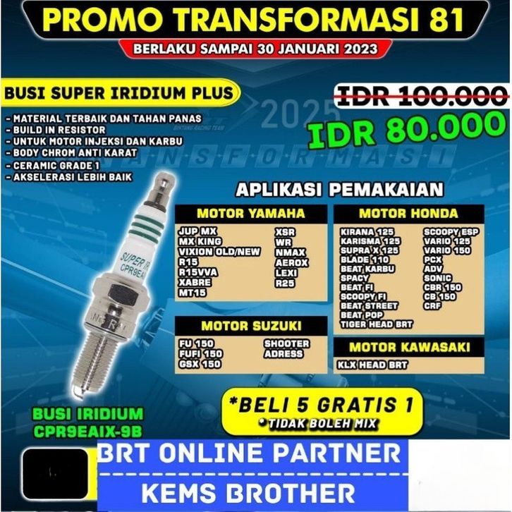 BUSI BRT IRIDIUM BEAT SCOOPY VARIO125/150 PCX CBR CRF KHARISMA SUPRA X125 SONIC ADV CB150 KIRANA BLADE110 SPACY BEA