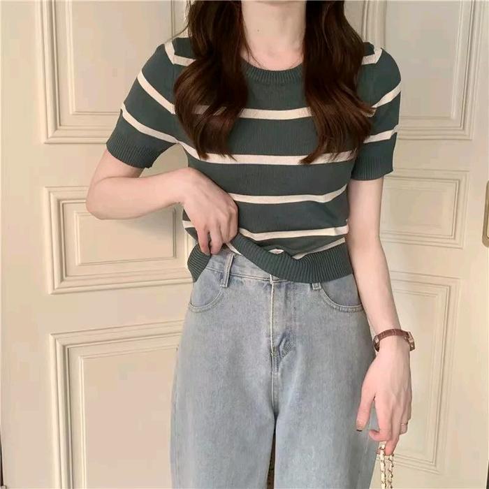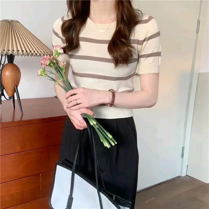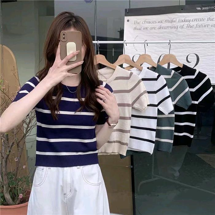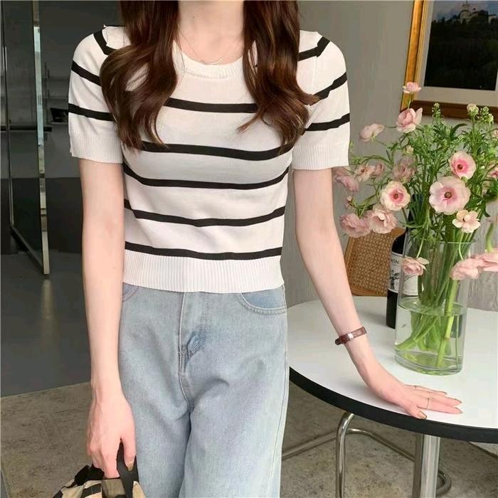 Atasan Rajut Crop Top Wanita Stripe / Baju Wanita Crop Knit / Casual Top Setrip Fit Tebal