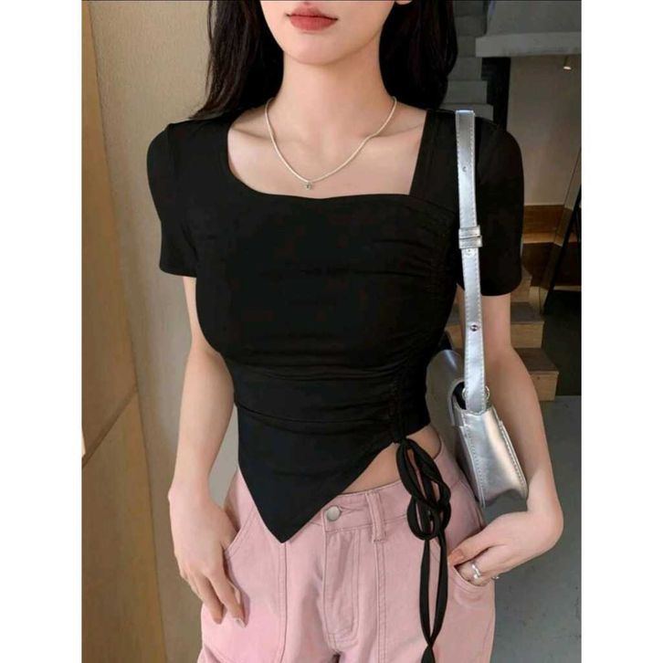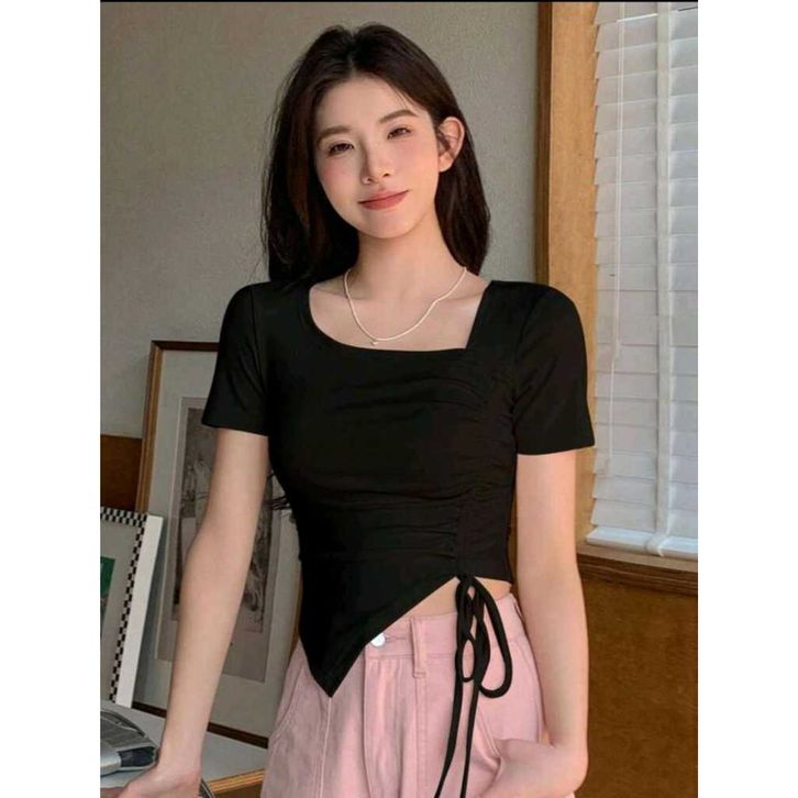 Crop Top Square Neck Tali Serut Samping Lengan Pendek - Kaos Wanita Korean Crop Top Terbaru 6058