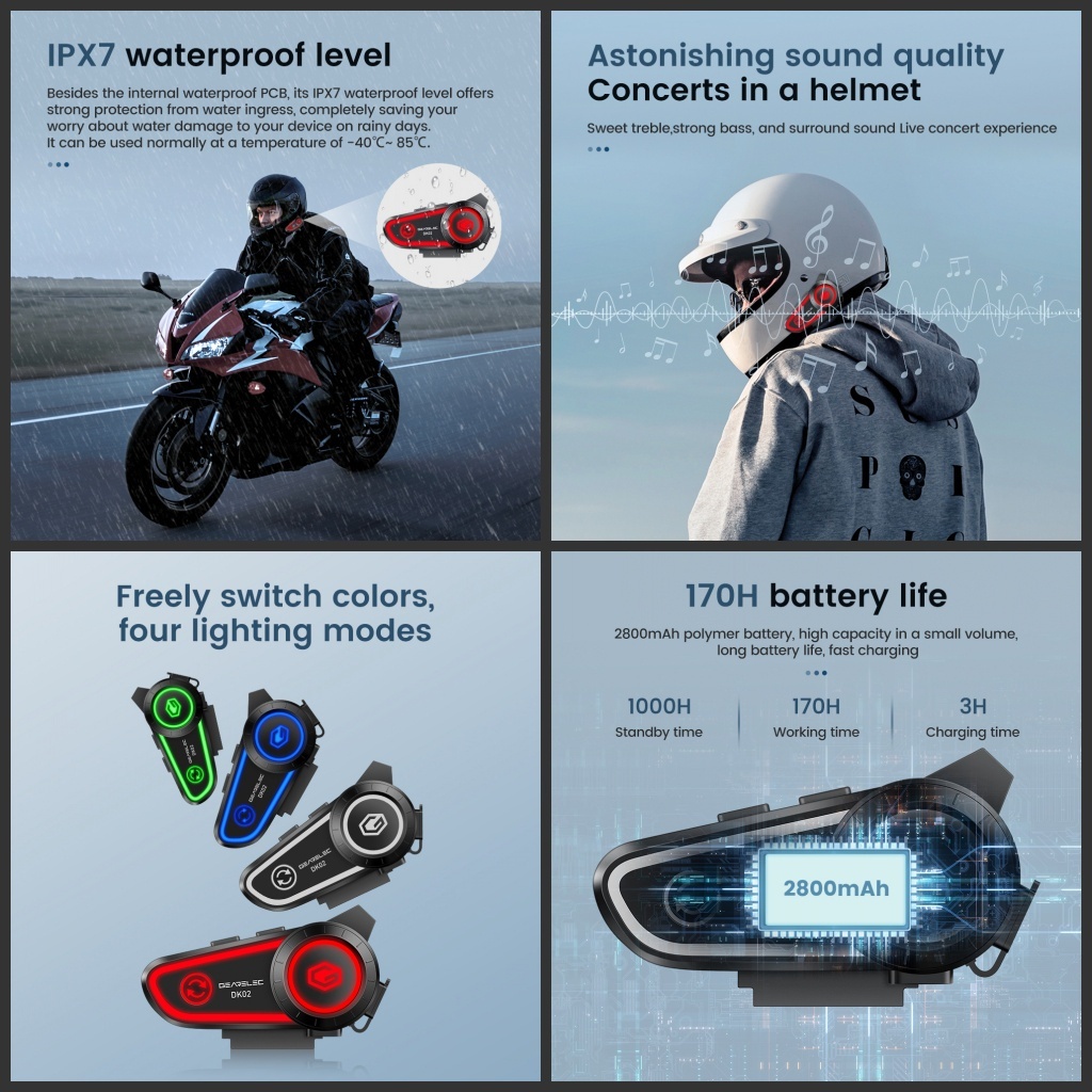 Gearelec DK02 BT5.2 Helm Sepeda Motor Bluetooth Headset Hands Free Call Kit IPX7 Tahan Air 2800Mah
