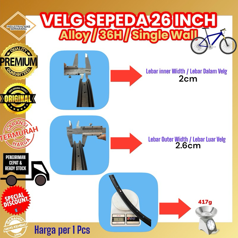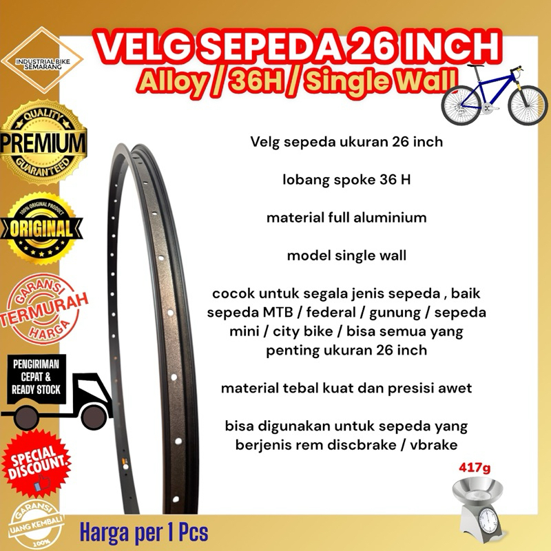 ( ALUMINIUM VELG 26 INCH / 36H / SINGLE WALL ) Rim Rims Velg Roda 26inc Sepeda Lubang 36 H Mtb