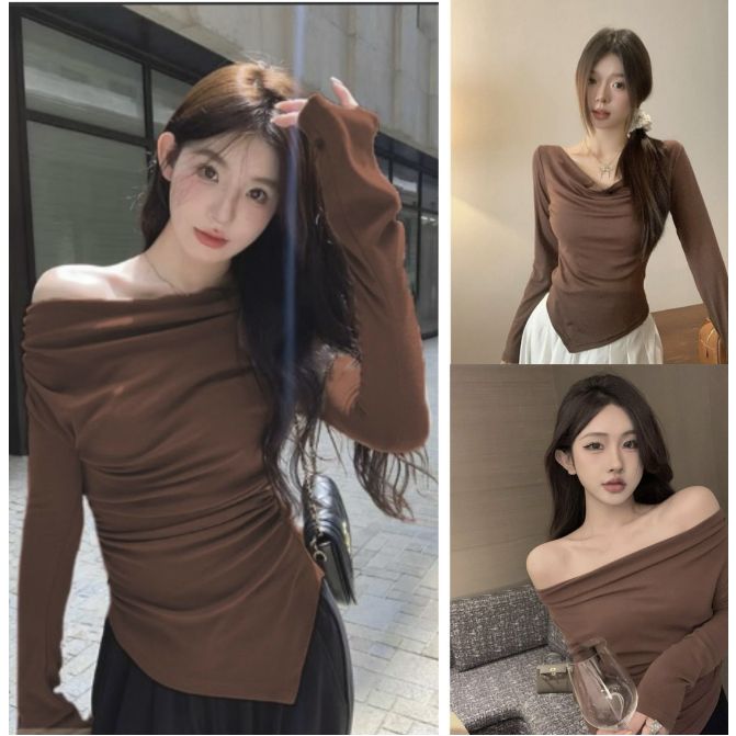 EMITA BLOOM Baju kaos crop top wanita kekinian lengan panjang korean style import crop top long sleeve one shoulder kor