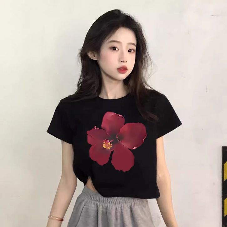 The Monseur Gallery Kaos Crop Wanita Slimfit Flower Design Hibiscus Orchid Kaos Crop Top Y2K Fashion | Baju Croptee Hi