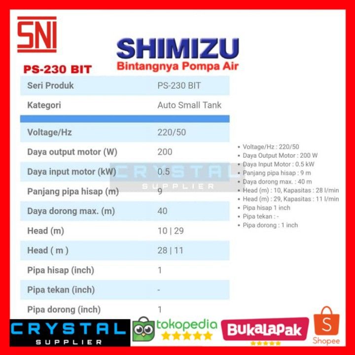 POMPA AIR SHIMIZU PS-230 BIT / PS230BIT Dangkal Otomatis 200 Watt
