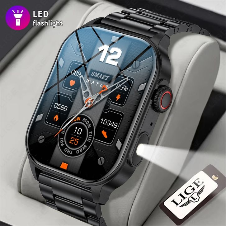 Smart Watch Pria 2.01 inci Layar HD Dengan Lampu LED 370mAh Tahan Air Luar Ruangan Monitor Kesehatan Olahraga Jam