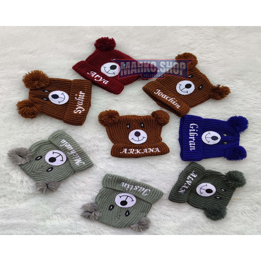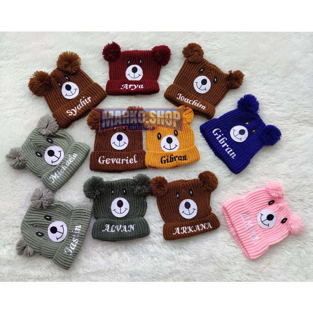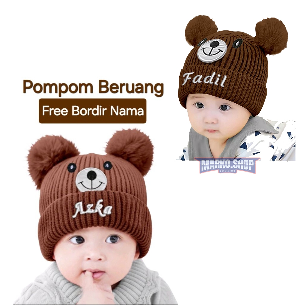 Topi Bordir Nama Kupluk Anak Bayi PomPom Beruang Bordir Kupluk Anak Laki Laki Perempuan Termurah