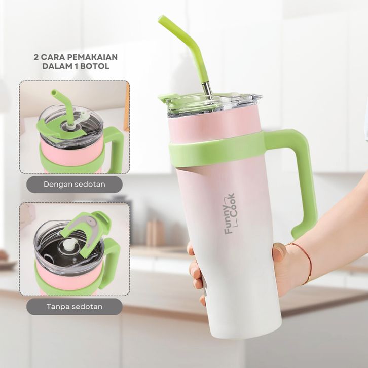 FUNNYCOOK Botol Minum Tumbler Ice Hot Stainless Steel Sedotan / Tahan Panas / Tahan Dingin 1,2L