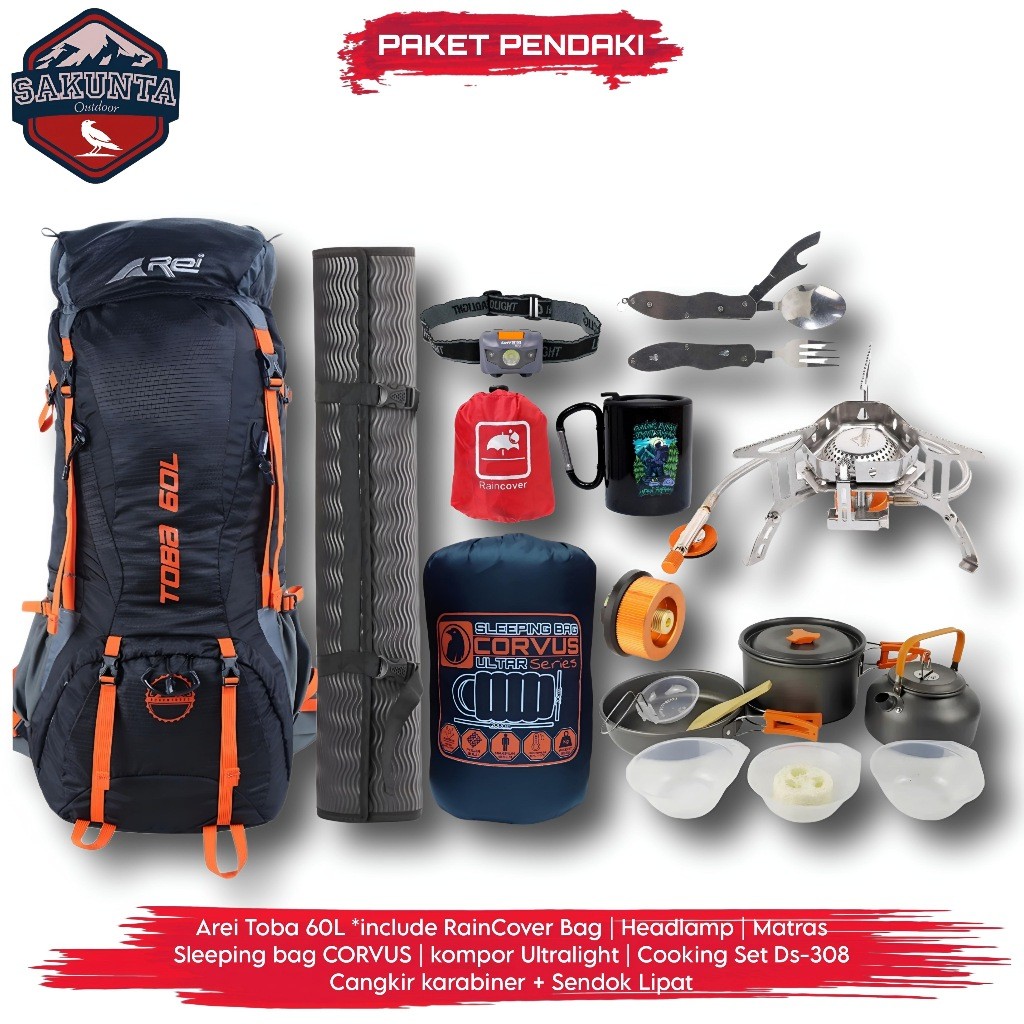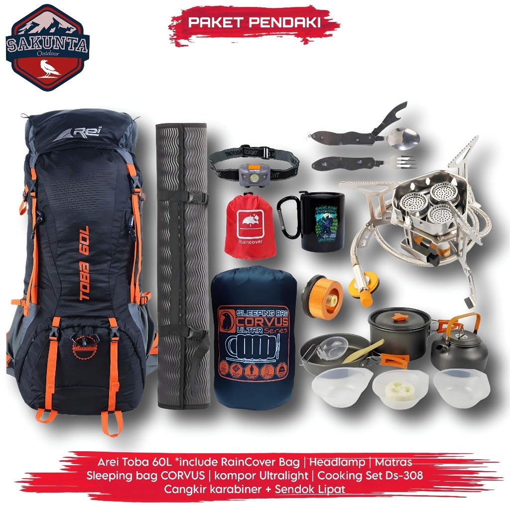 SAKUNTA OUTDOOR PAKET LENGKAP PENDAKI GUNUNG TAS CARRIER REI AREI TOBA 60L KOMPOR CAMPING COOKING SET PAKET HEMAT ALAT P