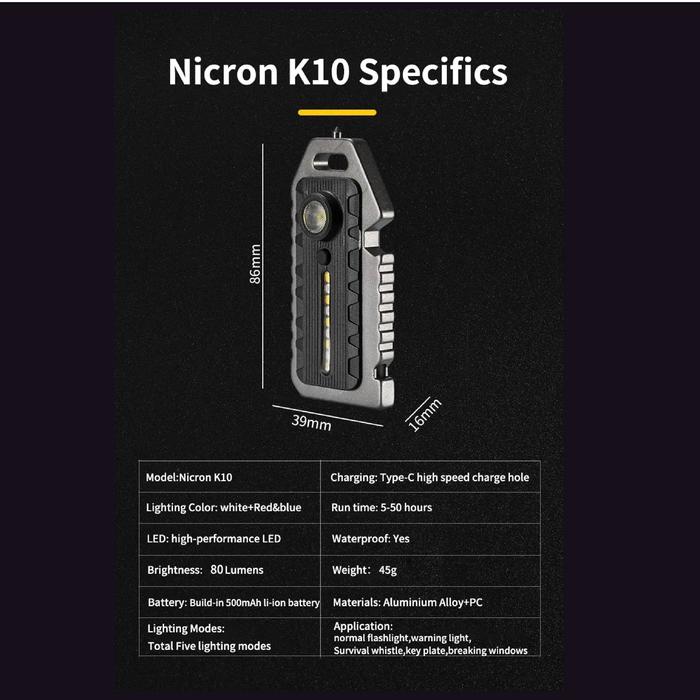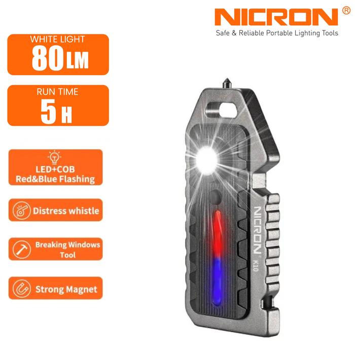 Nicron K10 Multi-function Keychain Flashlight - Mini EDC Rechargeable for Emergency Light White