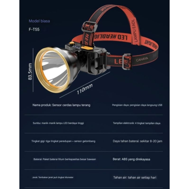 Senter Kepala T18A 50W Mode Zoom Dan Sensor Gerak - Cahaya Terang - Bisa Di Charge- Waterproof