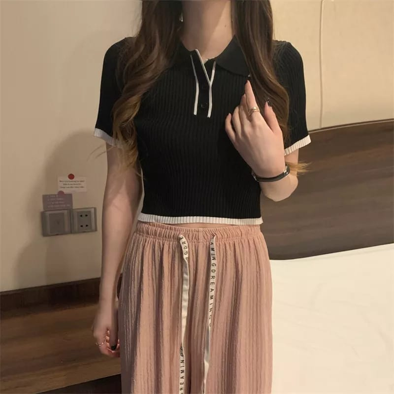 Tshirt Kerah Polo Crop Top Rajutan Harajuku Pakaian Crop Wanita T-shirt Putih Solid Lengan Pendek Shirring Wanita Blus H