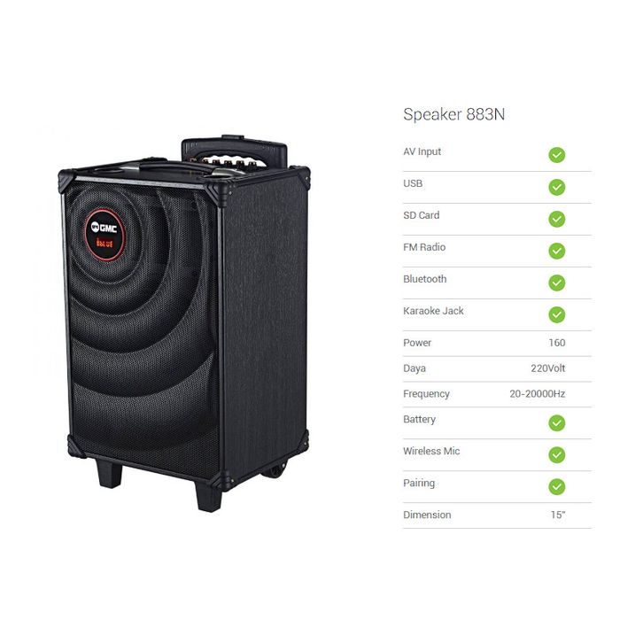SPEAKER PORTABLE GMC 883N KARAOKE WIRELESS MIC BLUETOOTH TROLLY 15 INCH (K)