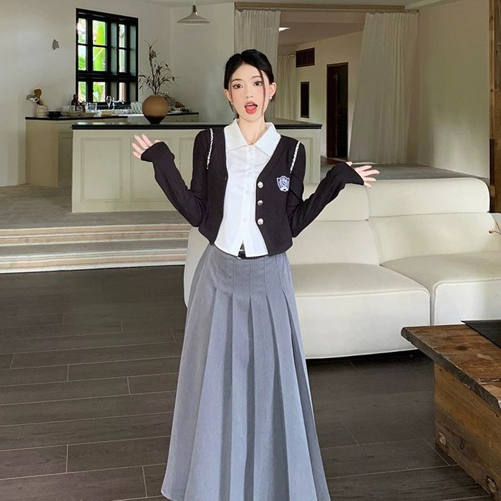 kemeja pria ABESTONE Kemeja Polo Lengan Panjang Wanita Ala Korea Atasan Crop Tambal Sulam Hitam Atasan Rajutan Slim Fit